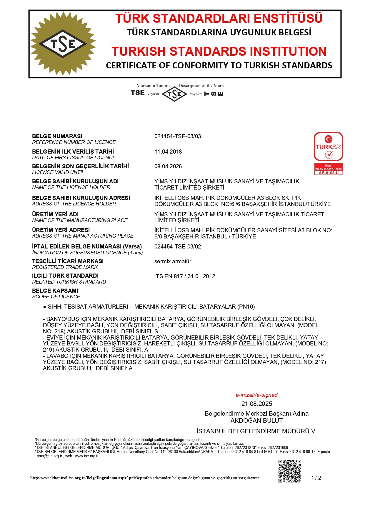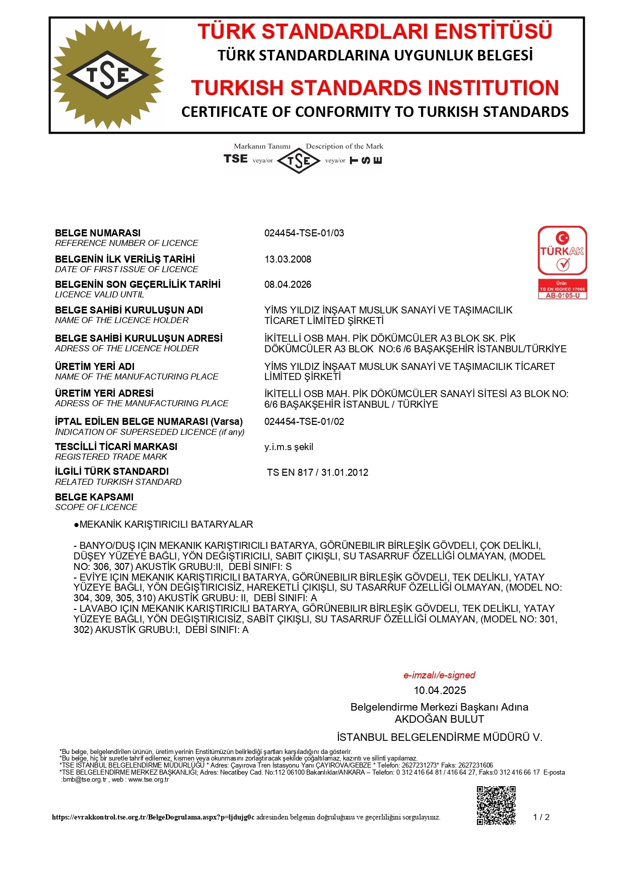 Firmamız 2008 yılında Türk Standartlarının en son ve en yeni normlarına göre vermiş olduğu TSEN200 ve TSEN817 belgelerini almış olup yine 2008 yılında ISO9001 belgesini alarak üretimde kalite ilkesini belgelendirmiştir.